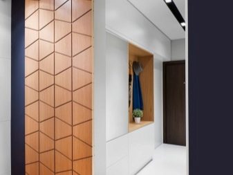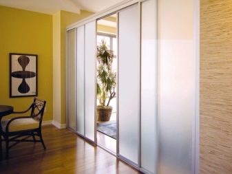 Frameless door designs with polycarbonate inserts and dividers of light wood, selected according to the principle of compatibility with the facade of furniture and floor design.