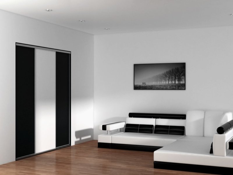 Coplanar black and white sliding doors fit perfectly into the ideological composition of a modern minimalist interior.