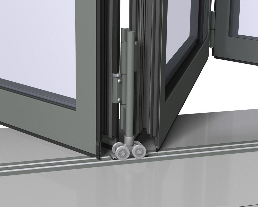 A more practical option is possible when the door leafs move along two monorail or telescopic rails mounted in the ceiling and in the floor.