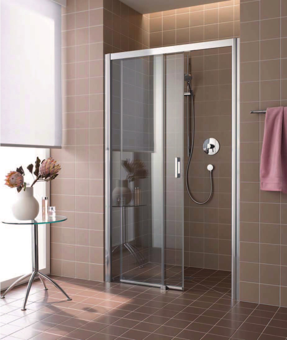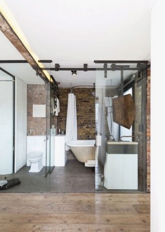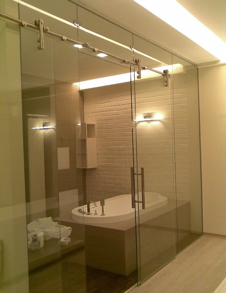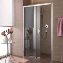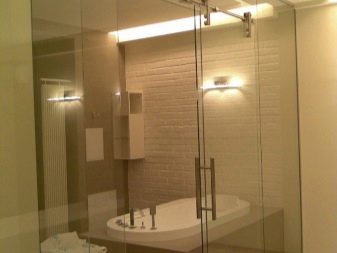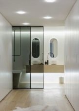 - Glass sliding design in a metal profile. This is a true example of luxury and grace. The door consists of two transparent canvases of considerable size. It perfectly emphasizes the overall style and lightness of the entire room, but this model is suitable only for spacious apartments. In addition, transparent doors in the bathroom will appreciate not everyone.
