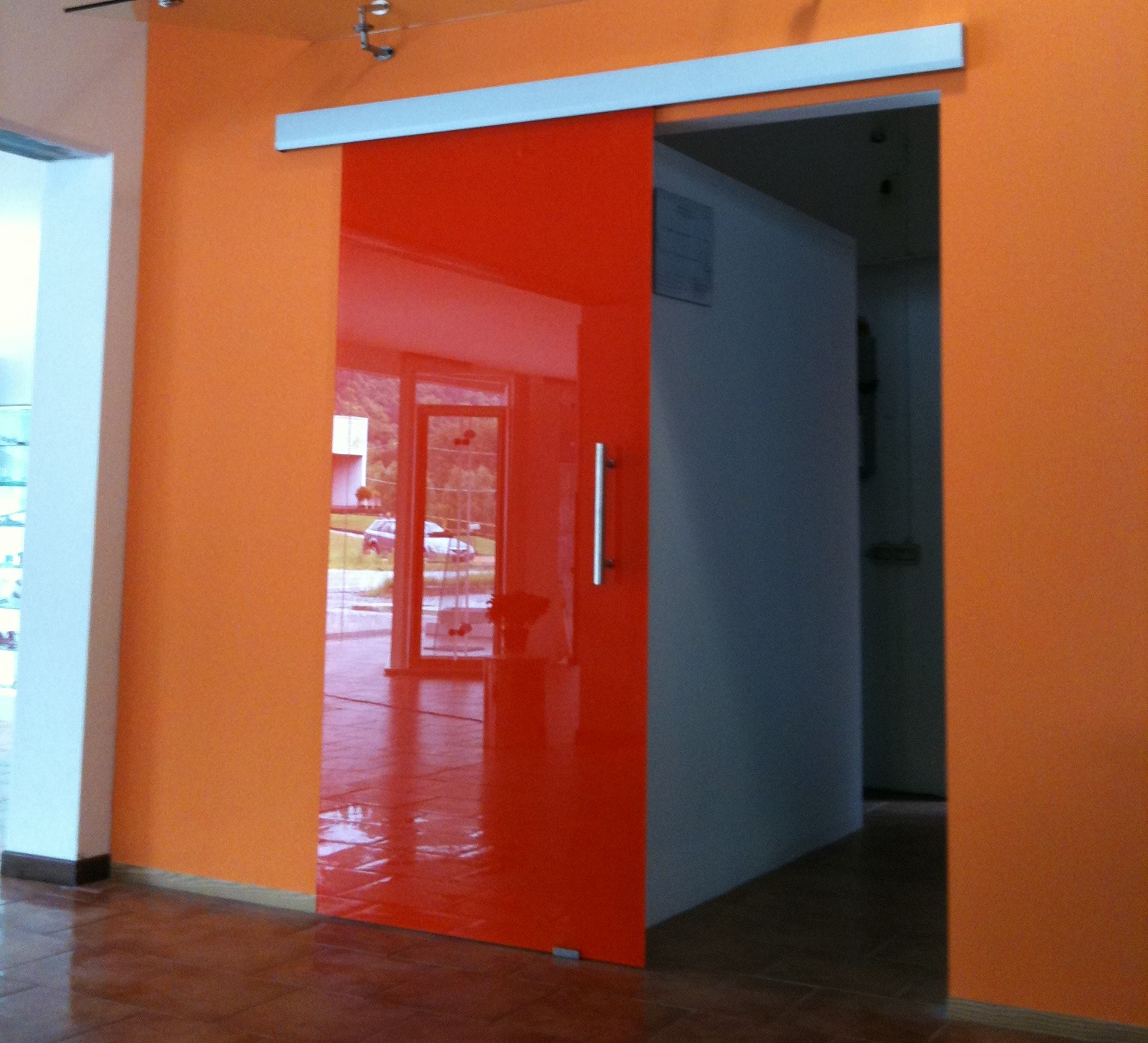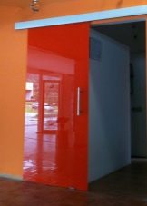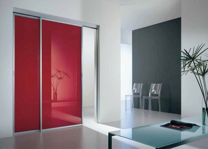 - Stylish red sliding door. This model consists of two red glossy canvases. This option is perfect for a designer apartment, it will become its functional decoration.