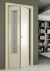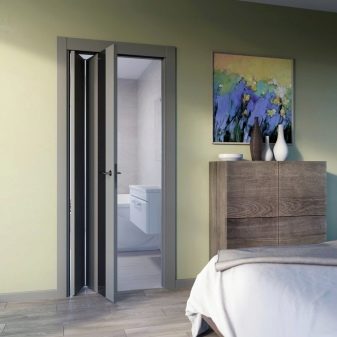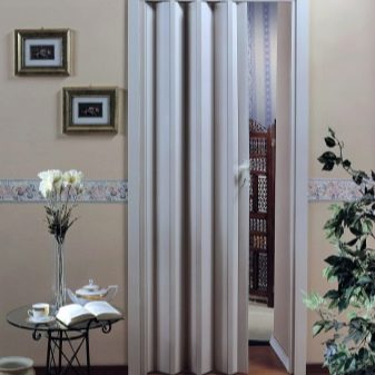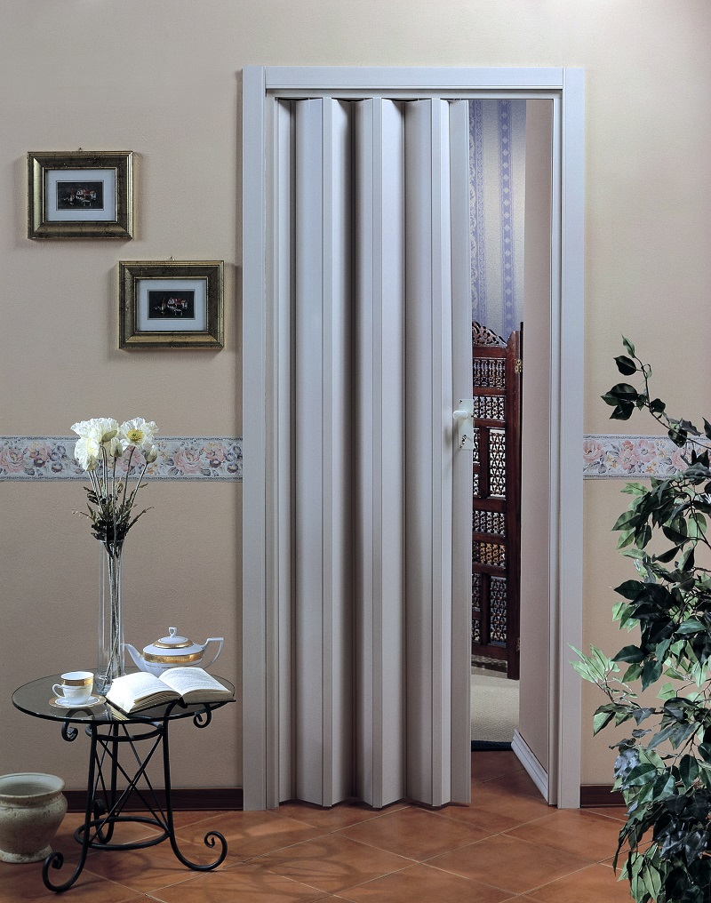 The doors can also be made of one or several leaves, which are made of several narrow vertical lamellae, interconnected by means of reliable fastenings. Such models of doors are folded on one side of the opening, thereby occupying part of the free space. Since the thickness of the canvases is rather small, such a fact will not be a significant disadvantage for you.