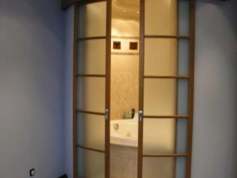 - Coupe. Coupe doors for bathrooms and toilets can be with one or two doors. Such structures move parallel to the walls, for this purpose guides are used. Canvas doors of double doors diverge in different directions from each other.