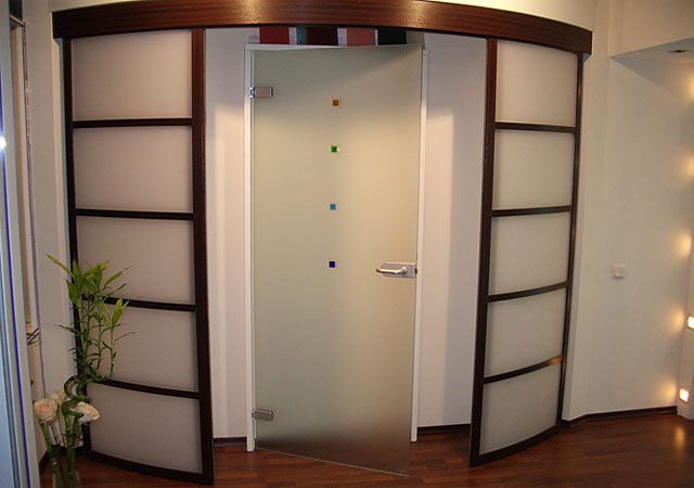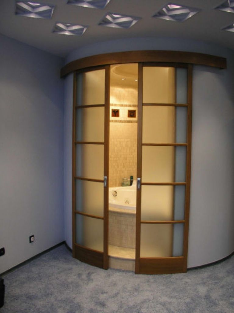 - Radius. Such designs look very impressive and unusual. The movement of the doors of such doors is in the form of a semicircle. This is a rather original version of the door,However, it is not always suitable for small apartments. But for designer interiors, this option fits very well.