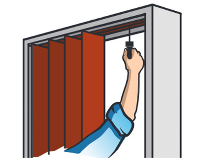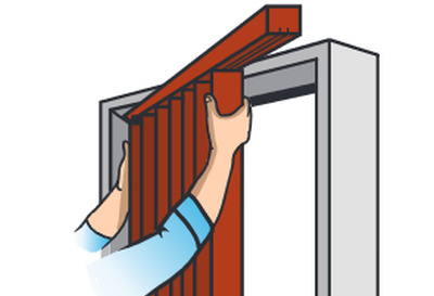 Then you need to properly hang the door-accordion. To do this, remove the guide from the opening and install the supporting plates inside it. Next, you need to fold the panels by the type of accordion and raise the design so that the carriages are at the top. While holding the profile, gently place the construction with the rollers in the groove and the rotary axis into the hole in the support part.