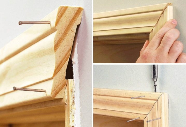 Now we should proceed to the installation of platbands for the opening. Already prepared parts should be cut with a hacksaw at an angle. It remains only to fix the trim. This can be done with hidden fasteners or liquid nails.
