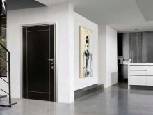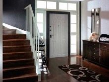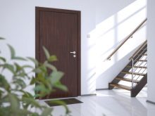 The entrance door, which is colorfully matched to the floor of a particular room, looks beautiful and stylish. Therefore, a door with an identical shade is perfect for a dark floor. It does not have to be exactly the same color as the floor. Its color scheme can be close to the floor palette, and then they will look like a single composition.