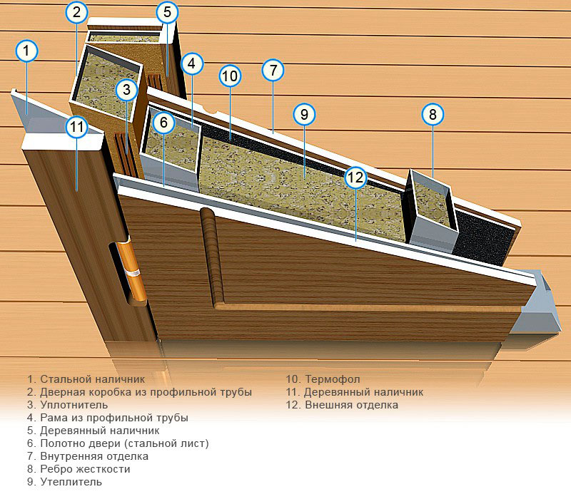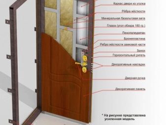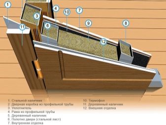 If the construction is still not divided into parts, then it is possible to do work only outside. Such products are assembled from two metal sheets that are welded to the frame in advance. The door is trimmed with soundproofing material from two sides, then made additional exterior trim to give the model a neat appearance: