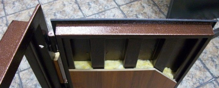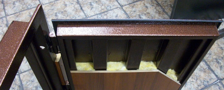 - Mineral wool. Excellent material both for warming, and for sound insulation. It is easy to install, but needs protection from moisture. The design of the door becomes heavier due to the installed additional stiffeners, which reinforce the door frame.