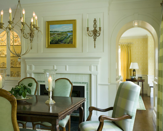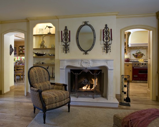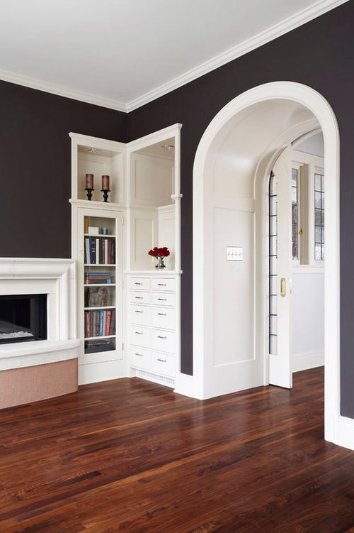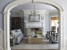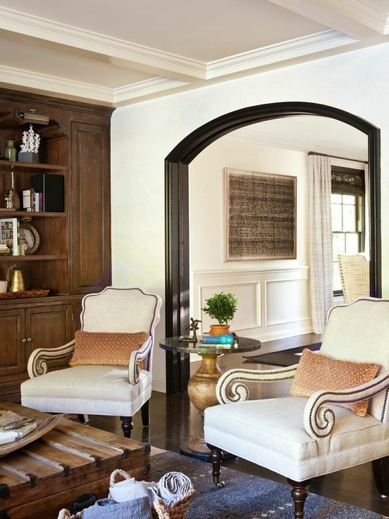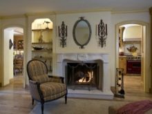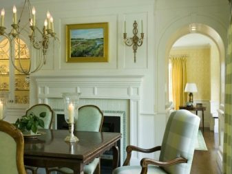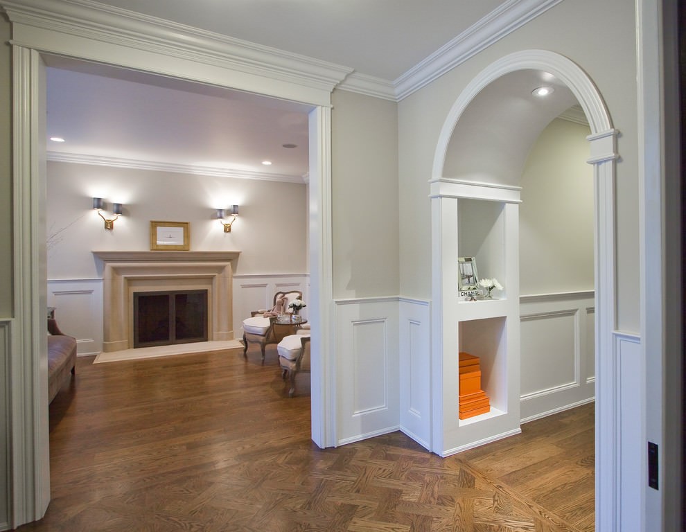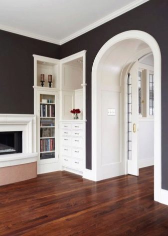 Ordinary arch, made in a contrasting color, can set the tone for the whole situation. She often settles herself according to the rest of the room. In this case, all the elements agree well with each other: baseboards, arch, cabinets, fireplace. Facing the outer edge of the structure follows a simple geometric pattern on the ceiling plinths, thereby making the room become one.