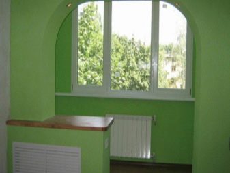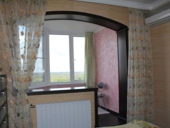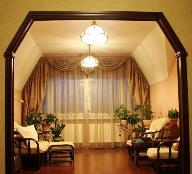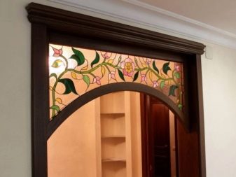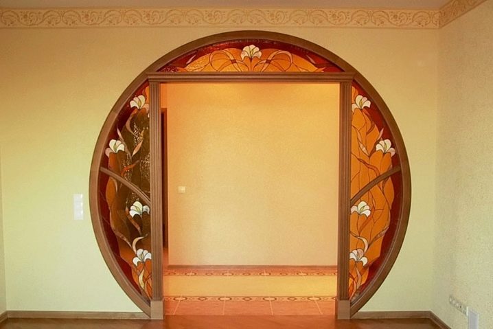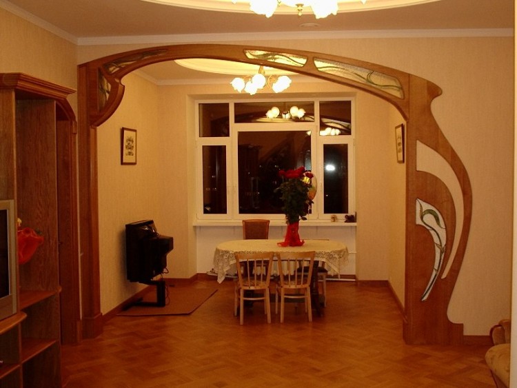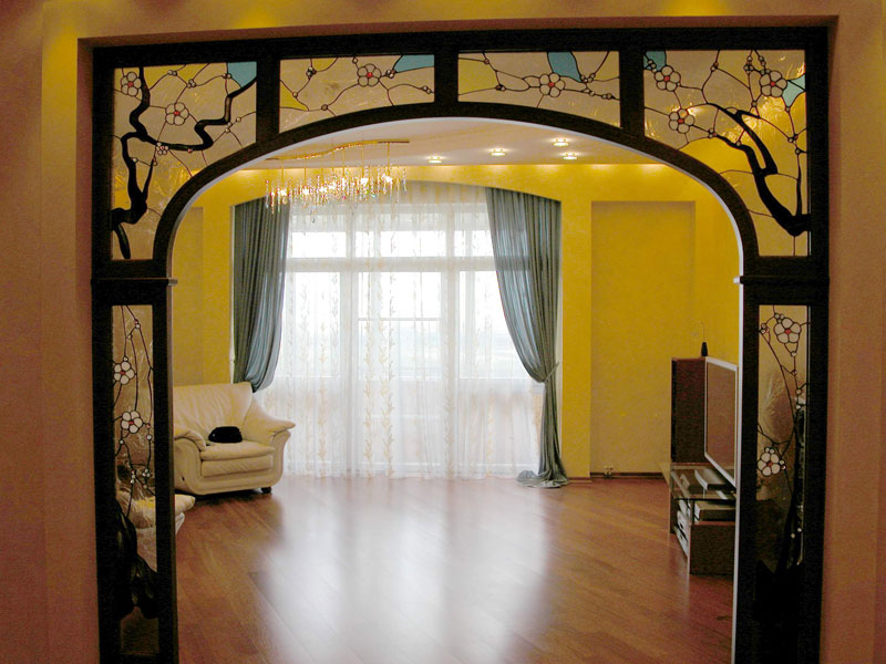 In this case, a false arch is recreated with wooden frames and stained glass. The design helps to further expand the room, since glass inserts at the subconscious level are not considered as an alternative to walls. Please note that the window opening is made in a similar form, but the entrance to the room is the accent of the whole composition.