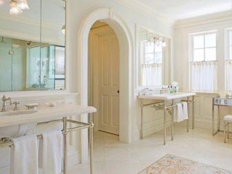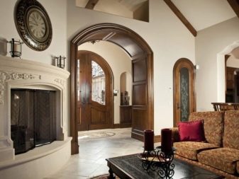 A fairly simple doorway with a slightly curved edge adds pompousness and grandeur to the room. Its unusual structure is made in fairly moderate proportions: straight lines are used, there is no complex decor. A virtually square shape contributes to the visual preservation of the proportions of the room, without creating any visual illusions.