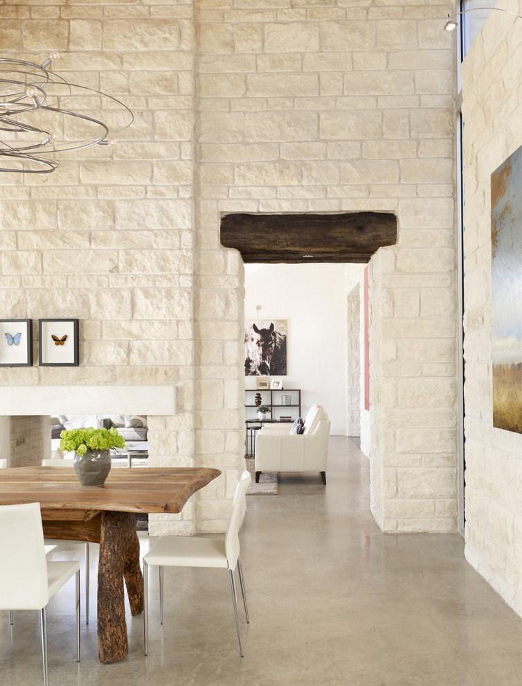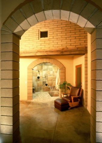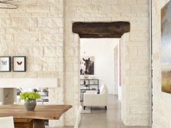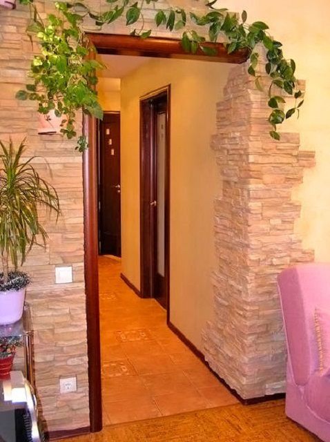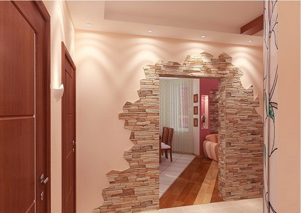 The use of natural materials is encouraged when creating a doorless design. Wood and raw stone harmonize well with each other, despite the fact that the tree is selected valuable breed, and the stone - the most common. The game of contrasts deserves special attention: first,Contrasting wood and stone are used, and secondly, the smooth edge of the wooden platband is adjacent to the ragged edges of the masonry.