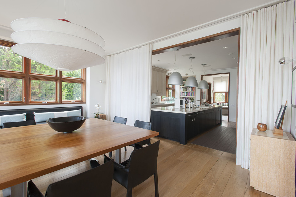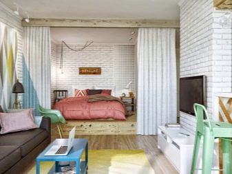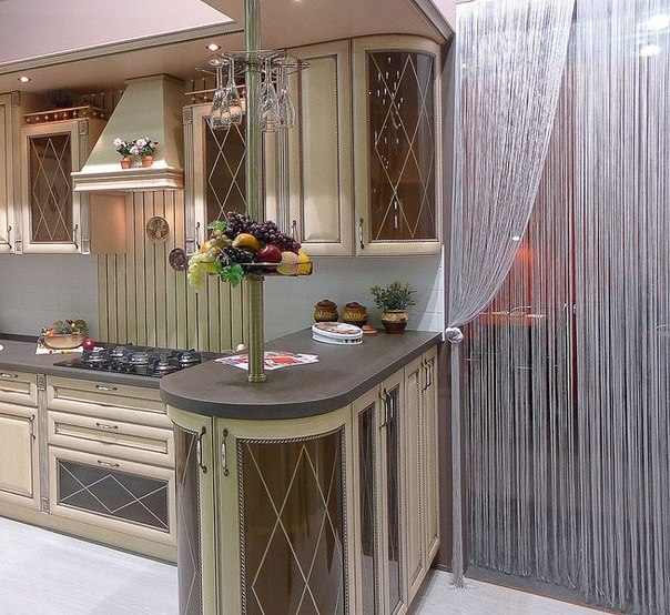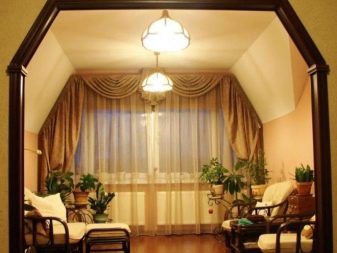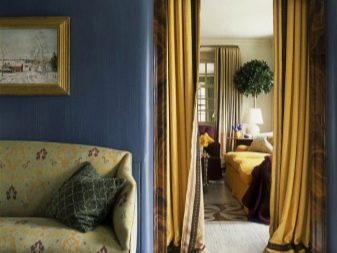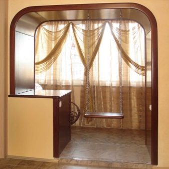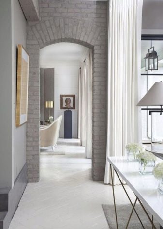 Decorative curtains play the same role as the door psychologically, but it takes up much less space. If desired, the curtains can be removed without any problems or replaced by others, while the type of construction of the opening will not be affected (for example, if you just remove the door leaf, there will remain hinges on the span that do not look very attractive).