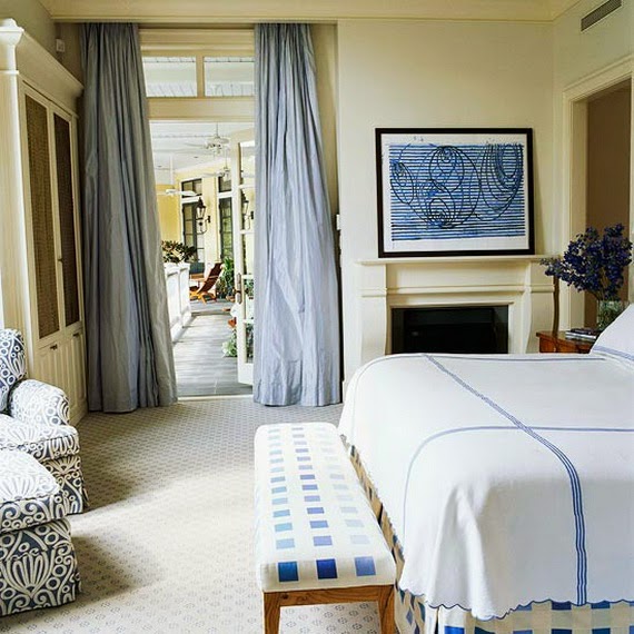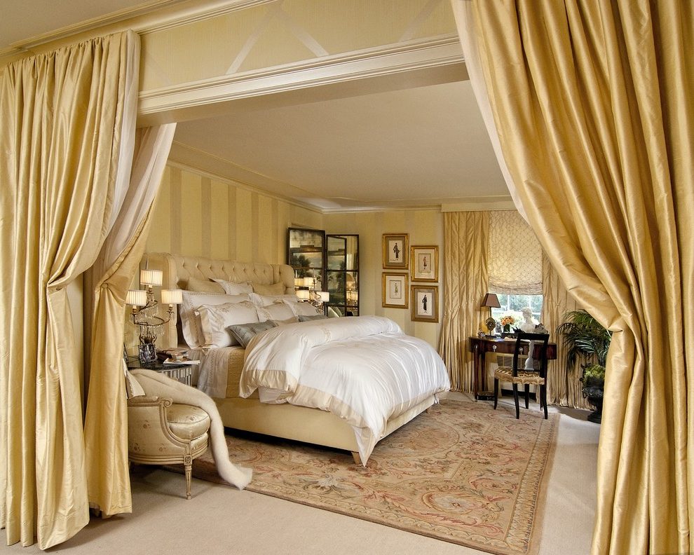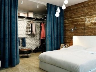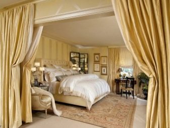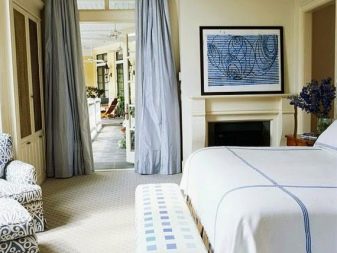 Quite rarely refuse the door to the bedroom, but completely leave the entrance "defenseless" are not solved. Come to the rescue thick curtains or screenswhich perfectly protect the intimacy of the room. If necessary, they can be easily and quickly dismantled. An interesting solution is to use curtains with pickups: they can be completely closed at night, and in the daytime they will serve as a beautiful frame for the opening.