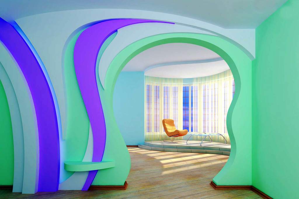 They can be made only in plasterboard walls-partitions. Asymmetrical openings can be of any shape, as well as be supplemented with all sorts of auxiliary details: shelves,niches, lighting. This design acts as a bright element and sets the tone for the whole appearance of the room. Eyeing myself Asymmetrical opening well helps to hide possible flaws in the repair of the room.