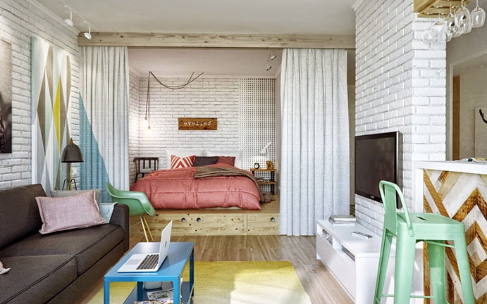 In small apartments, the doors between the hallway and the living room are abandoned, especially if the apartment is a studio. So the whole area is perceived as a whole, with the result that the dwelling seems larger.