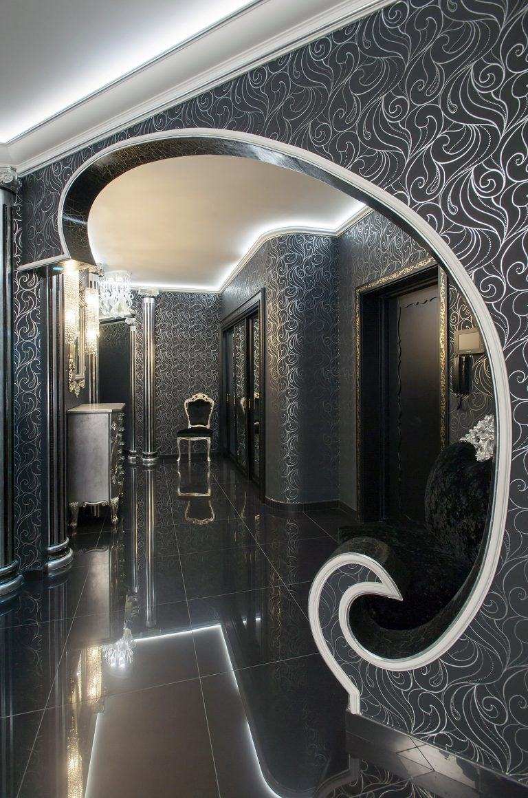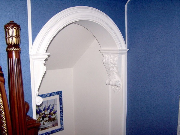With the help of stucco there is an opportunity to finish the openings in various styles. For example, you can make a classic arch with columns and heavy figured elements. If you add gilt, you can completely recreate the spirit of baroque or classical. For modern interiors, it is more appropriate to use simple embossed moldings with geometric patterns, for example, embossed grooves. If in the first case the choice was in favor of pilasters and capitals, in the second case they should be avoided.