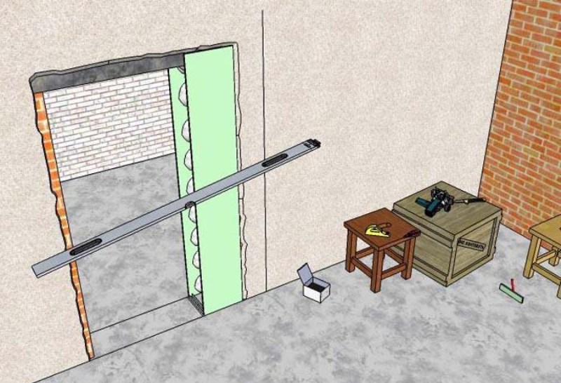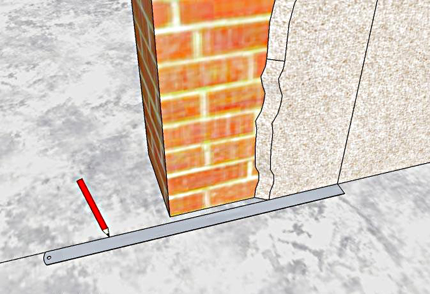 The prepared opening must be clean, the brickwork of the wall or concrete must be visible. Before the contraction, you need to make a markup: put a metal rule on the floor close to each of the walls. It should rest on the plaster wall.