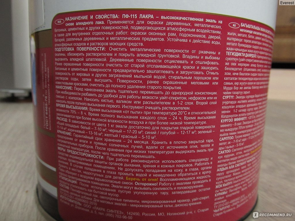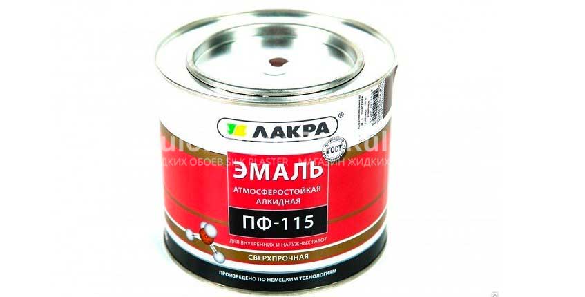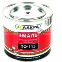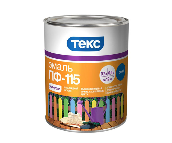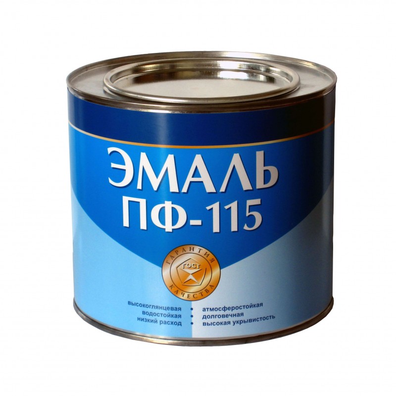 - PF-115. This composition can be freely used indoors and outdoors. Enamel is used for painting structures made of metal and wood, as well as for cement, plaster and concrete foundations. The coating is applied in no more than two layers. The composition dries completely after a day of paint work.