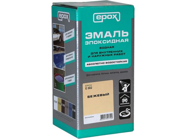 - "Rainbow". Epox VO-EP 270 is a waterproof epoxy enamel that can be applied to any product (concrete, wood, drywall, metal). It is used for indoor and outdoor use.