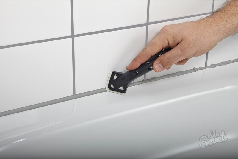 - Remove the tape until the composition has hardened to the end. If suddenly the seam has suffered at the same time - moisten it with water and level it. It is easy to scrub fresh traces of sealant from tiles and plumbing with a wet cloth. Solvent will help to cope with old pollution.