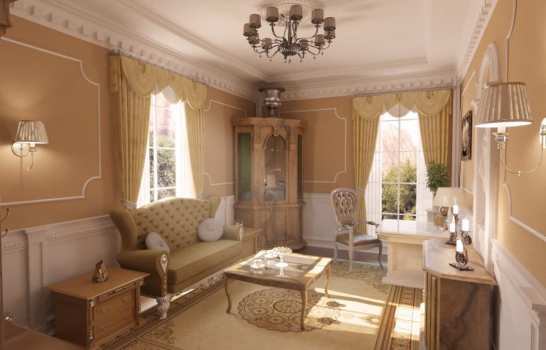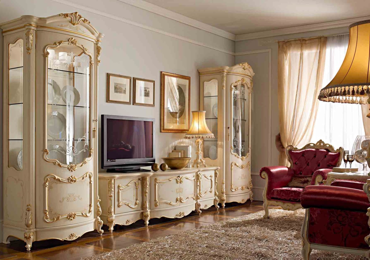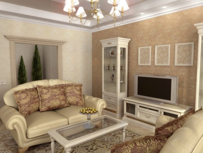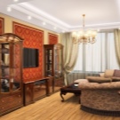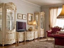 Looks great sophisticated furniture on carved legs. For its facades is better to choose a classic beige or ivory. Decorate the interior can stucco and elegant arches, ceilings with several levels. This is the only version of the interior of a small room, which allows the use of heavy curtains with drapes and additional accessories in the form of, for example, holders or elegant ribbons.