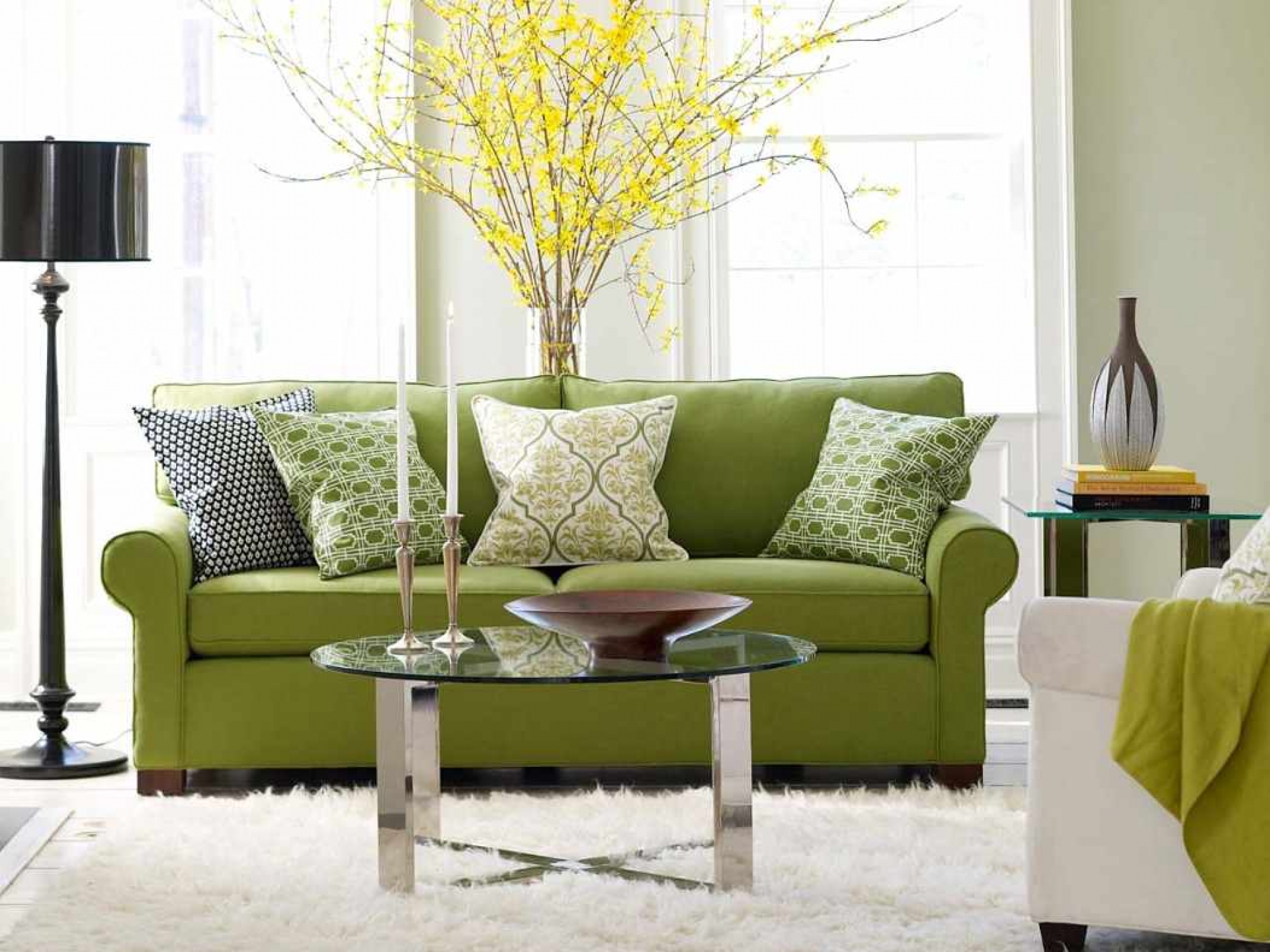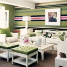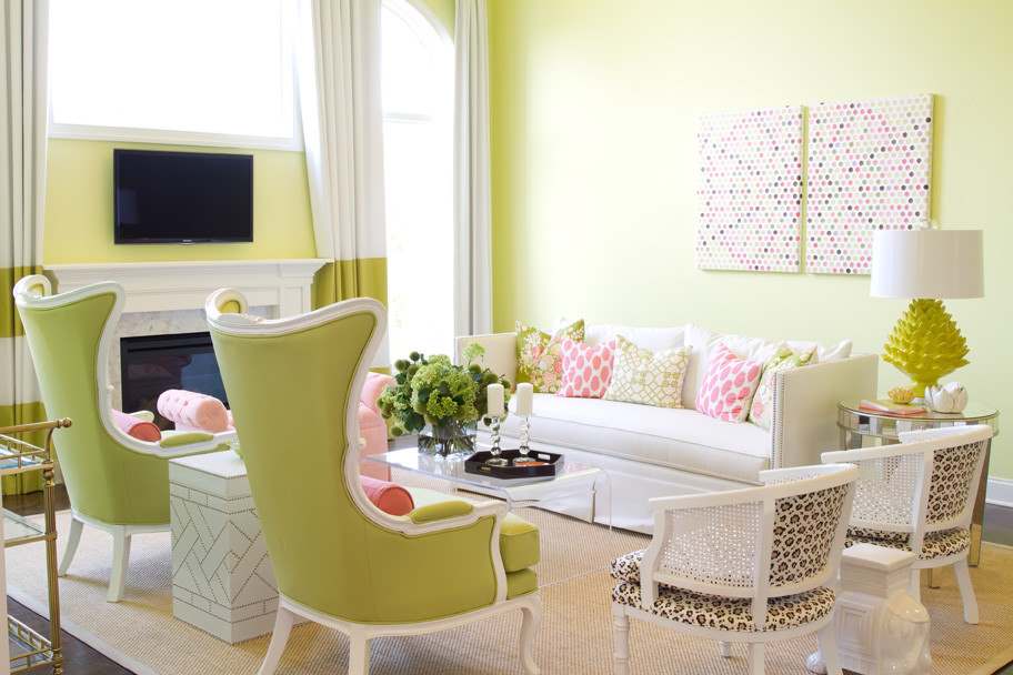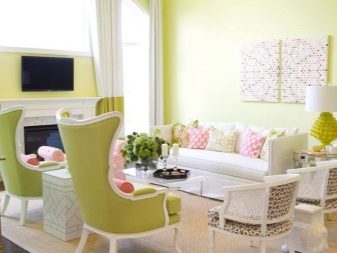 In the white living room will look great mint, pistachio, beige sofa-corner, as well as colored plastic tables and chairs.