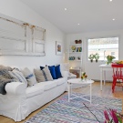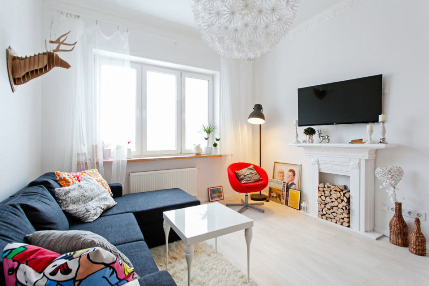 The following style, which is perfect for the design of a small living room - Scandinavian. It assumes the presence of perfectly white walls and ceilings, expanding the space and serving as a background for the internal filling of the room. Accents are arranged using bright and colorful elements in the form of paintings, lamps, unusual table tops, large alarms in a bright case, decorative pillows, clocks and statuettes.