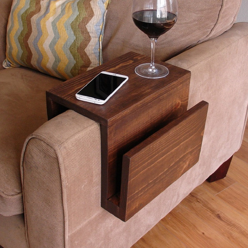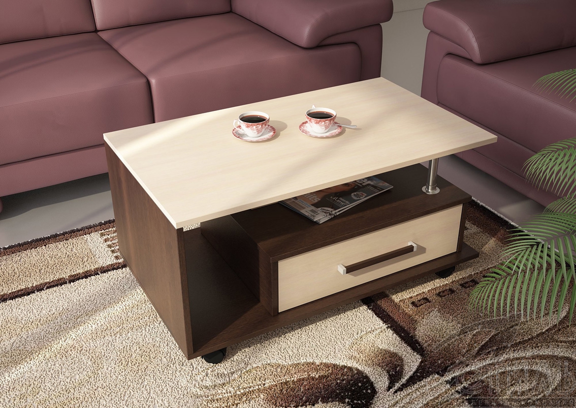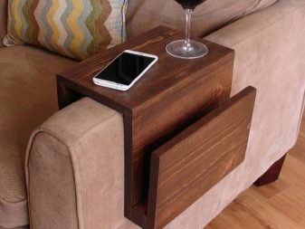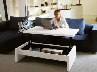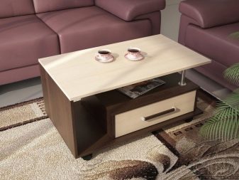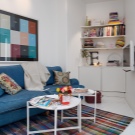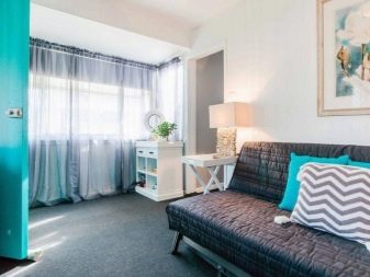 Near the sofa you can install a small bedside table, under which there will be a small pouf. Such an element of furniture can be easily hidden at any time and free up space. Coffee table is better to choose a light wooden or small glass. Lightweight version of a coffee table made of glass will look elegant and will seem almost imperceptible.