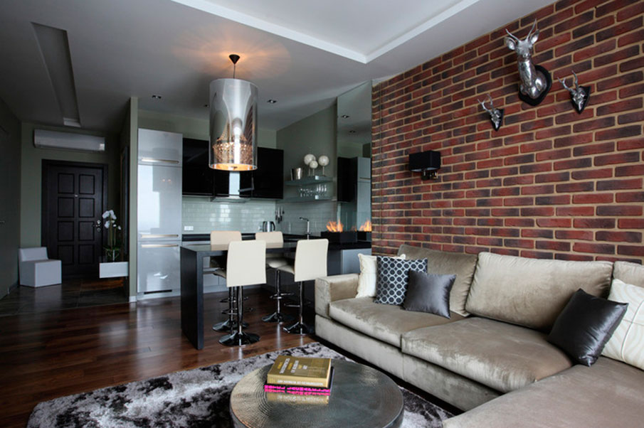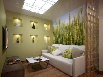 The coverings imitating a brick or a stone laying are perfectly suitable. Walls can have glossy or mirror elements, they can be additionally highlighted. You can independently arrange a niche in a wall of plasterboard, highlighting it in a contrasting color and placing in it some items of equipment or, for example, an aquarium. Also it makes a working area.
