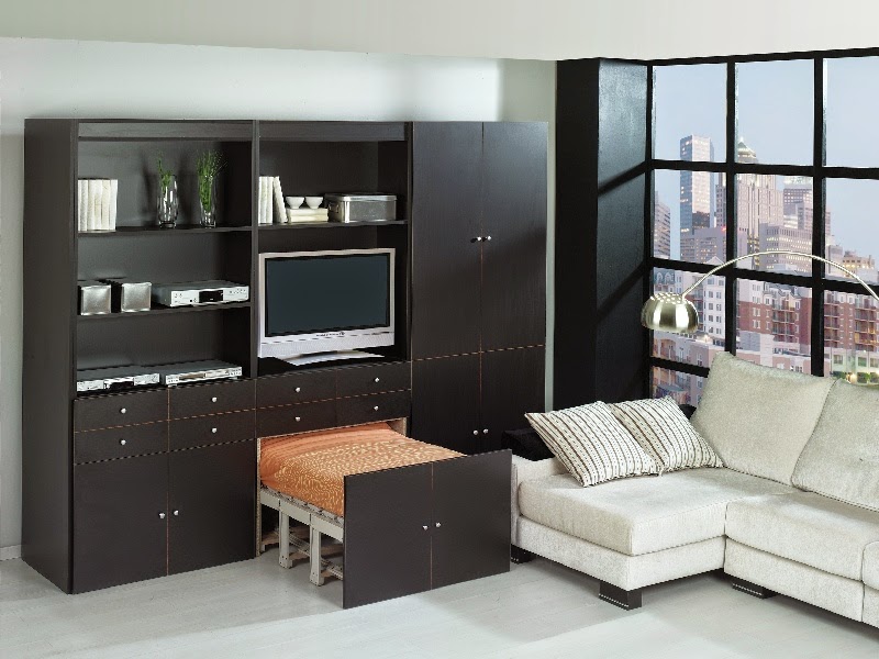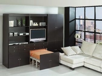 Tables and chairs are better to use folding. They allow you to provide additional guest space. Every living room should have a sofa. It is believed that it is the central part of the interior of the hall, in whatever stylistic direction the room is decorated. Therefore, it is better to have it in the central zone. It should pick up a compact folding sofa.Its upholstery should be combined with other interior items, the color of the walls and floor.