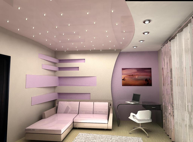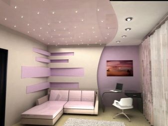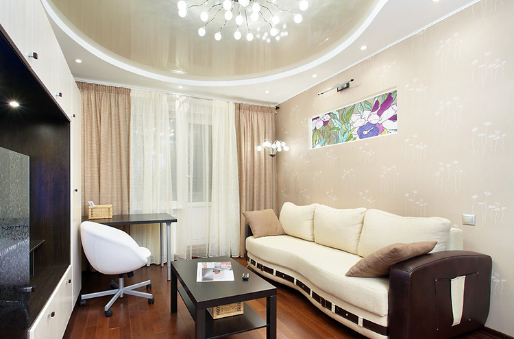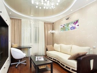 The ideal option for a small room is to install a stretch ceiling. It is better if it is white and glossy.Stretch ceiling can be chosen with a mirrored surface, it will make the space infinite. An interesting option is the installation of a two-level plasterboard ceiling. Such coverage will hide centimeters of height in separate zones, but it will look interesting and solemn.