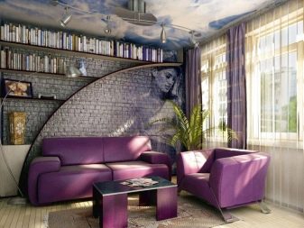 Modern living rooms are increasingly decorated in style. loft, despite the fact that it assumes the availability of free space. In this case, the interior is simply not cluttered with a large number of furniture and storage systems. You can put only a small sofa, a few soft poufs, bags, make light open shelves.