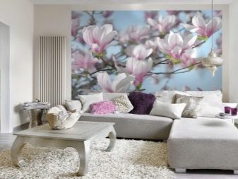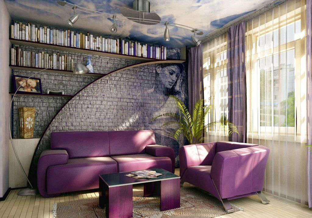 One wall of a small living room can be made more interesting by choosing wallpaper or covering with picturesque images. These can be landscapes, as well as images of a megacity that fill you with energy.