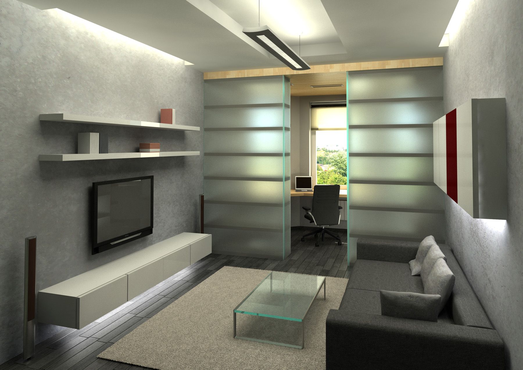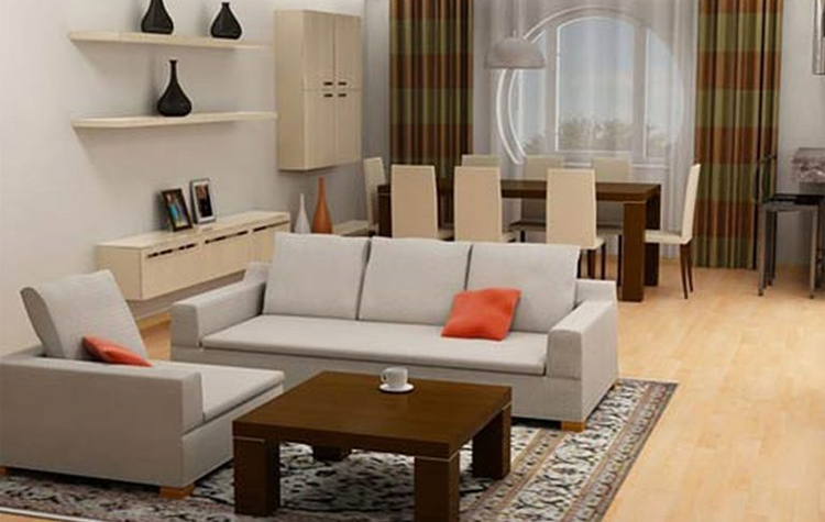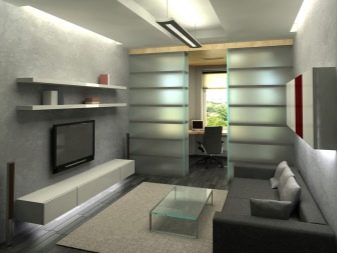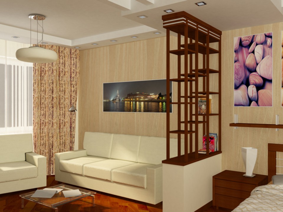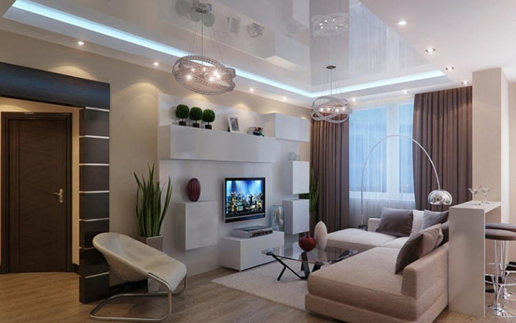 In small living rooms, it is customary to use comfortable and functional furniture that will save space.. When dividing a small hall into zones, no partitions and screens are used. Installation of glass and mirror elements of furniture is possible.