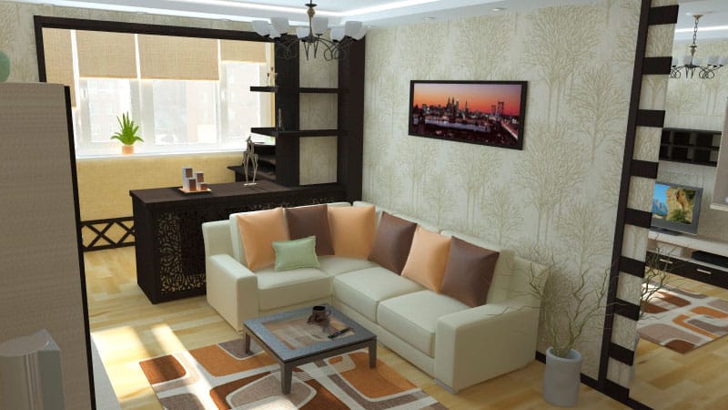 Designers recommend doing redevelopment small-sized living room, expanding it at the expense of the balcony. This design is a complete or partial demolition of the partition leading to the loggia. So you can additionally fill the room with light. Designers are advised to use angular furniture when designing small-sized living rooms, as it saves space.