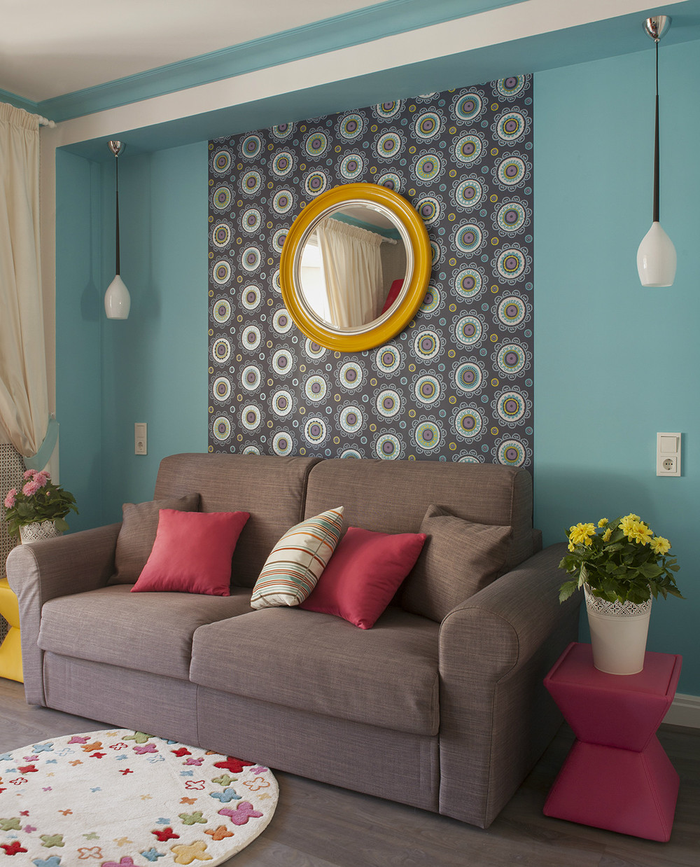 Right central wall for accents. It is customary to glue wallpaper with a print or an interesting coating with a 3D effect. Some patterns can deepen a room, make its interior more interesting.