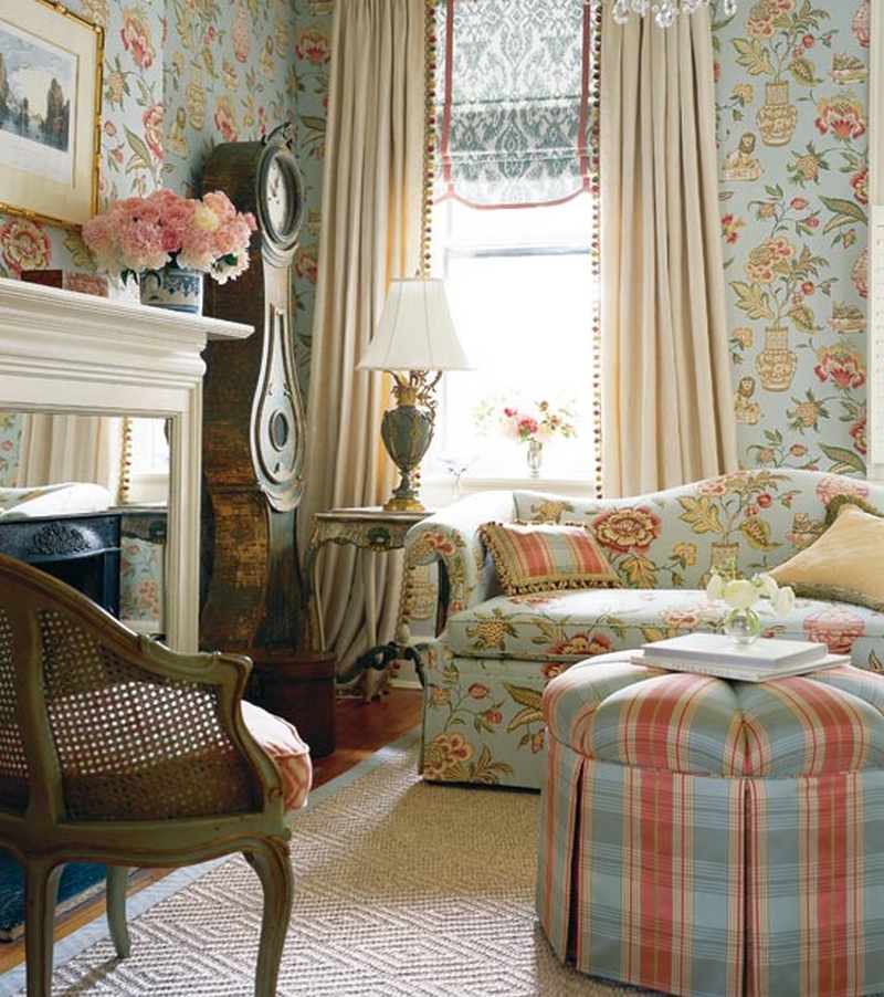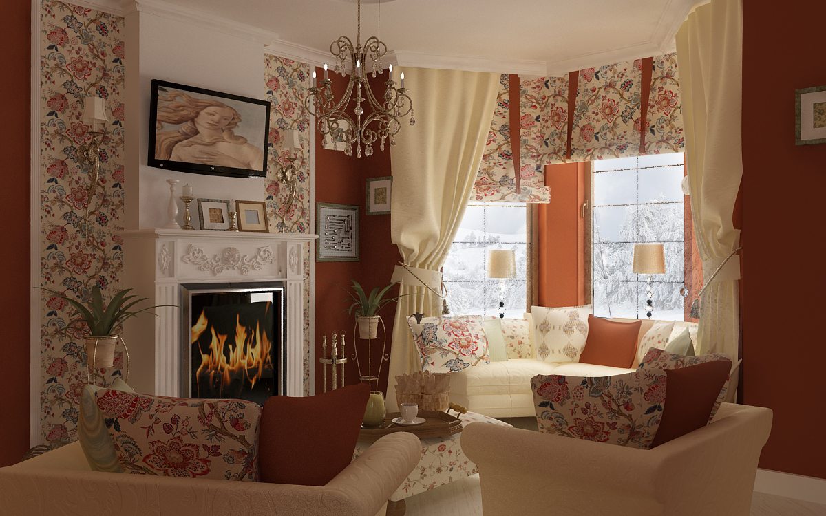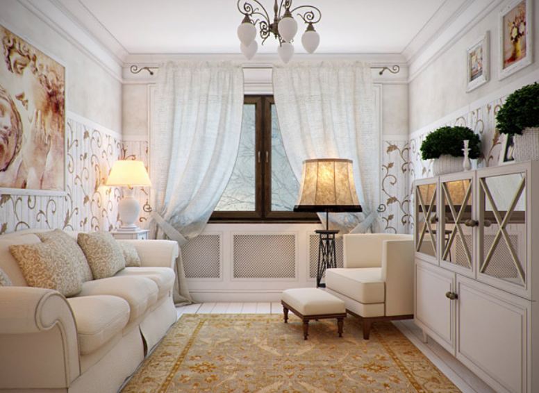 The next most popular style for small living rooms is romantic provence. It combines a rustic and French style. This is a delicate and fashionable interior design, suggesting the presence of lace trim on curtains and furniture upholstery, as well as a large number of floral and floral patterns. The room should be filled with delicate peach, pink, beige, gray elements of furniture and decor.