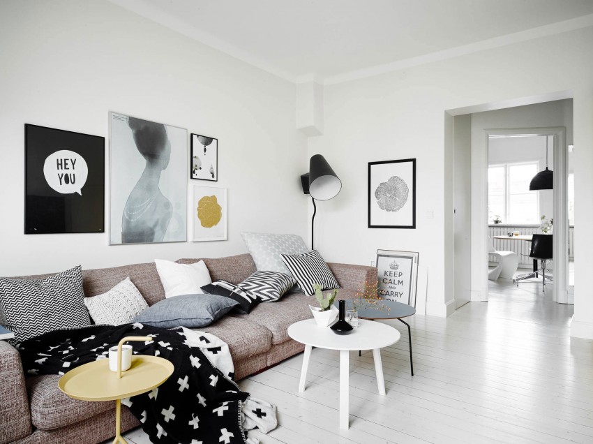 Black shades in the interior can be applied dotted, mainly in the decor items. It can be thin picture frames, wall clocks or floor lamps. Black gloss will fit into almost any interior of a small living room. You can purchase a coffee table with the design.