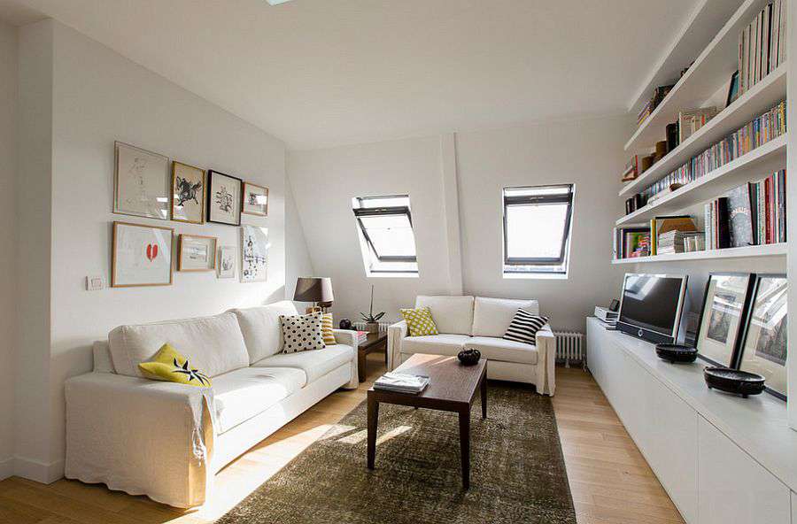Playing with shades, you can change the boundaries of space. The dark floor, light walls and ceiling make the room bigger, white side walls and a dark front one extend it to the sides. Light front wall and dark side deepen the room. If you do not want to decorate the living room in white, you can choose any tone related to pastel colors.