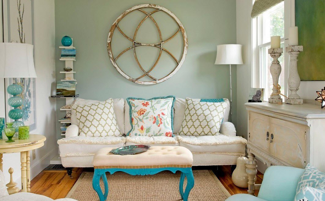 It can be beige, gray-blue, light green, pistachio and olive tones. They should be diluted with other warm shades. For example, a blue-beige small square living room looks interesting, this is a colorful design. This can be a baroque room or a stylish minimalist room.
