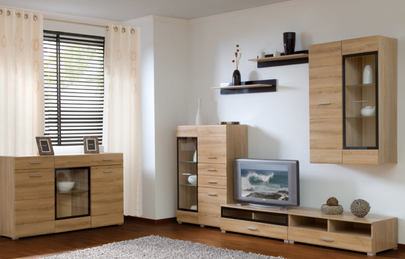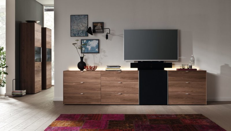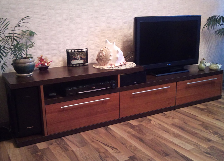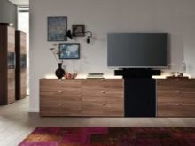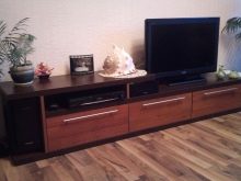 Many modern designs are suitable for placing TVs better than special walls. However, they take up much less space. The oblong surface and a number of rolled out drawers allow you to fit a lot of things into a chest of drawers, so many people like such products. If your TV is plasma, it is easy to buy a chest of drawers, equipped with a mobile platform for it. So expensive equipment can be used only as needed, and the rest of the time it will not take up space, accumulating dust. There is also no risk of accidental damage to the equipment from active children or curious animals.