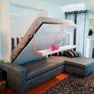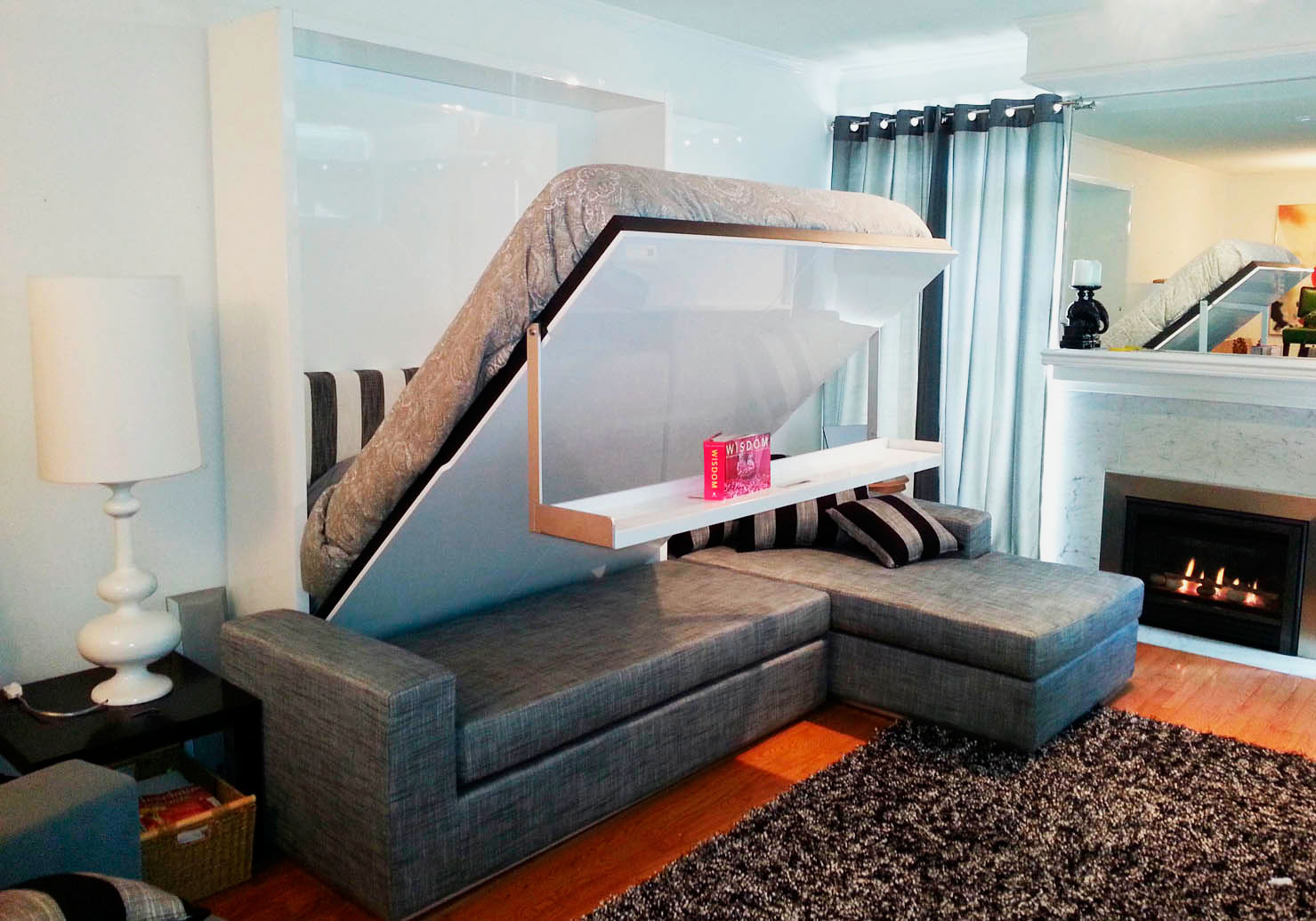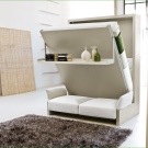 When the hall is rather small and there is almost no space left in the presence of a double bed, you can use the lifting bed reception. It is easily retracted into the closet, freeing the entire room before nightfall. Such a secret bed will be the ideal solution for rooms with dimensions of no more than 18 square meters. Another option could be a large sofa that unfolds under a bed for the night, and serves as a living area during the day.