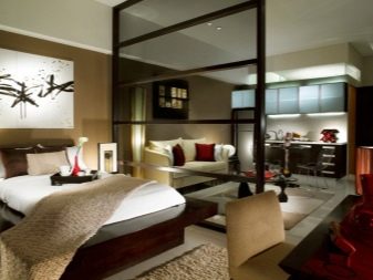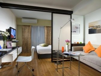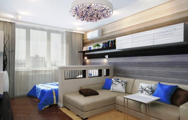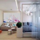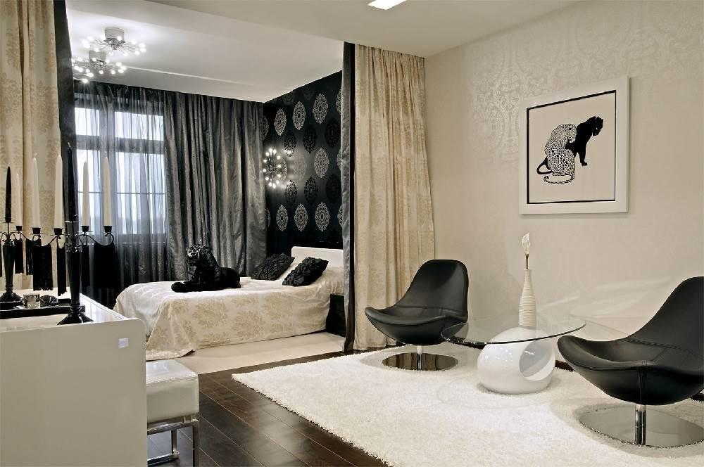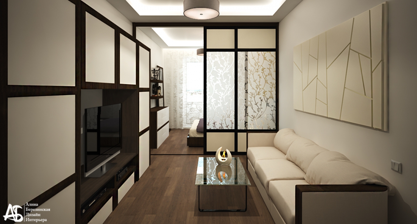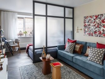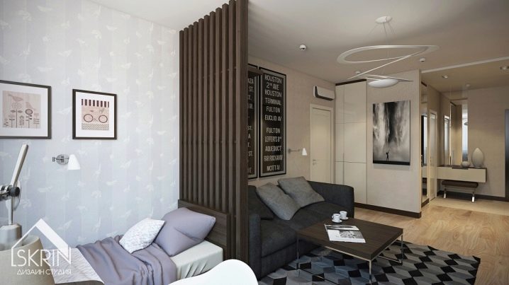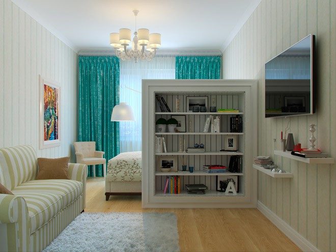 The simplest way to separate the two halves of a room is to usecabinet or shelving, which is best painted in a contrasting color, but withstand the overall style of repair. To make the bedroom more distinct from the living room, it can be painted white or any light shade, whereas in the living room, a variety of colors and textures can be left.