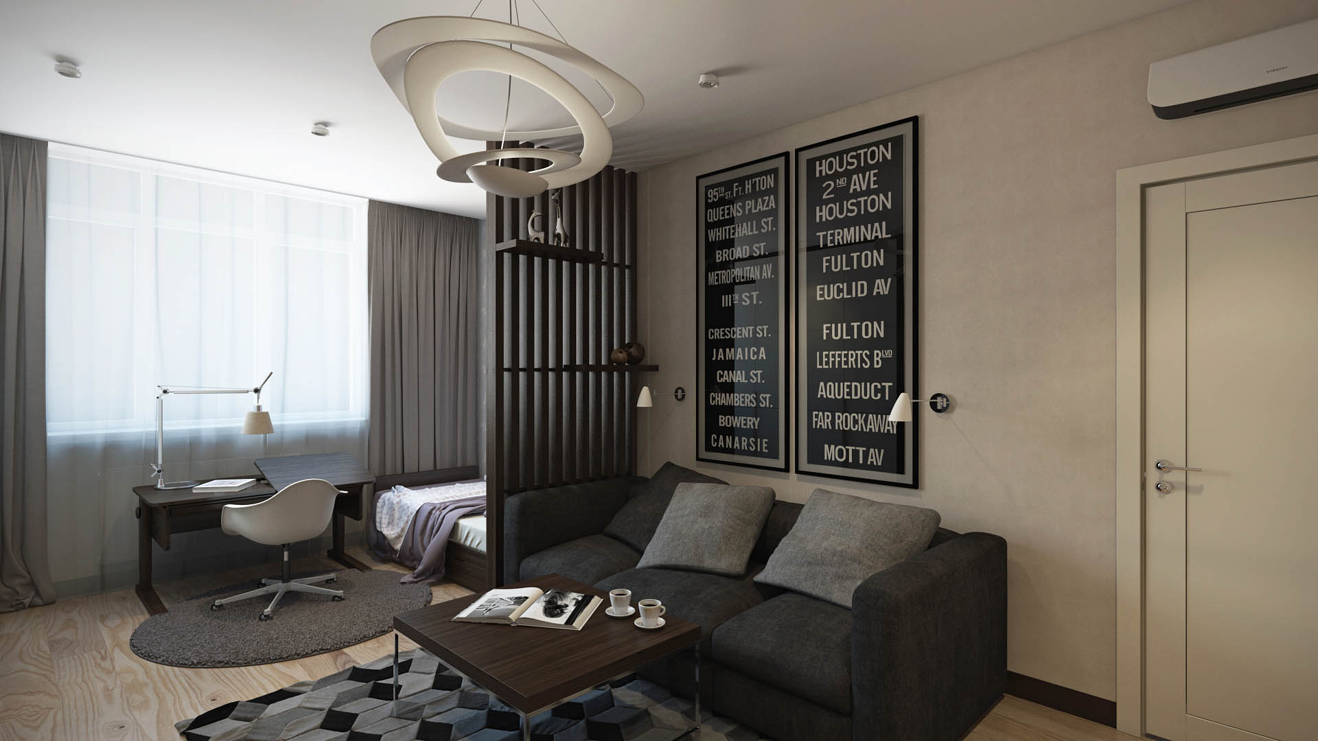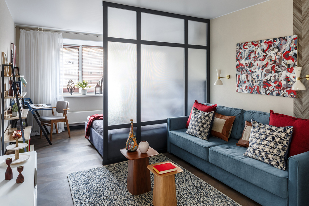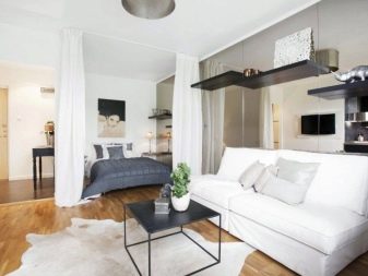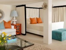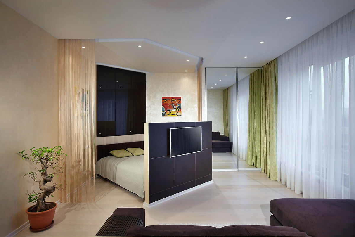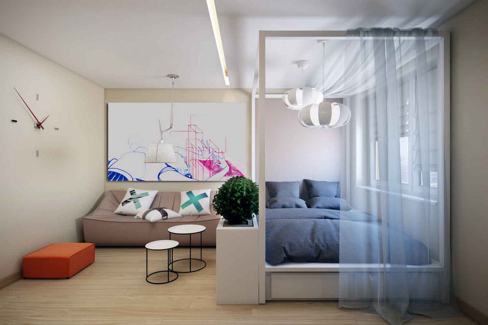 Another option would be to use textile dividers. With the help of curtains and fabric barriers, it will be possible to separate the living room area from the bedroom, as well as give the opportunity to fully relax and sleep alone, and spend time watching TV or reading a book to other apartment residents.