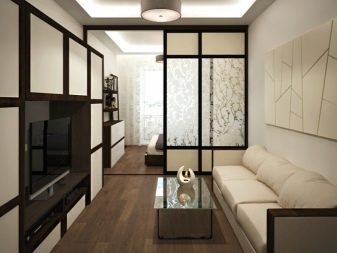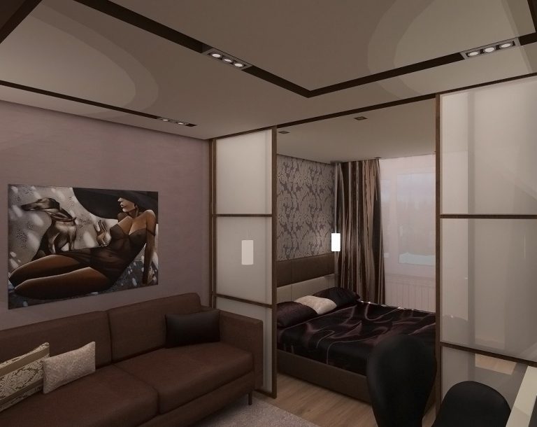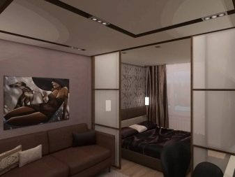 If we talk about the sleeping part of the room, then the most logical thing here will be the placement of a large bed, especially when it has two beds or a bed of medium size, if someone is sleeping alone. If you do not intend to permanently divide the room and use curtains, then instead of a bed you should put a folding sofa or a transforming chair so that after sleep you can clean everything up and there is again more space in the hall.
