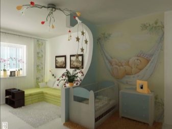 If the sleeping area is planned for a child, then it is important to equip the room with a cot. Depending on the age of the baby, a cradle or a sofa, which can be a transformer if necessary, will be suitable to maximize the space for the arrival of guests or on another occasion.