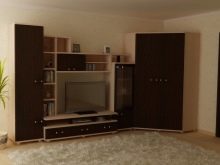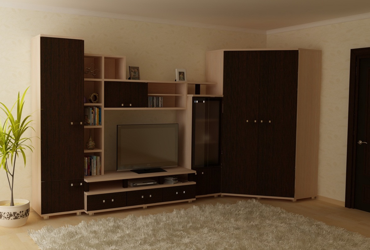 - Corner wardrobe - this is the best option for a small living room. This model is located in the corner. This closet is compact, allows you to significantly save room space. The niche under the TV is located on a wider side, there are also additional shelves and compartments for other things.