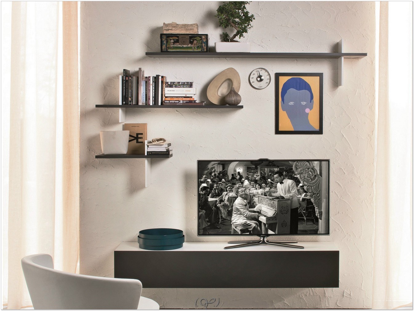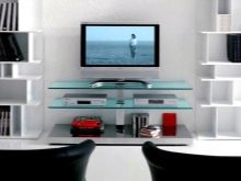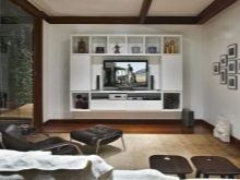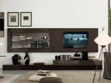 In living rooms with a small area it is important to use the shelf to install the TV, which is fixed on the wall of the room. Given the weight of the TV, such a detail must be distinguished by reliability and durability. In the manufacture of shelves using wood of different breeds, high-strength glass and drywall.